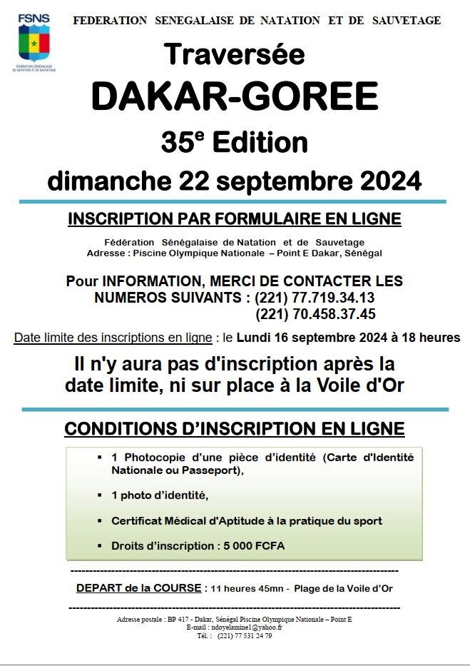 La Fédération Sénégalaise de Natation et de Sauvetage (FSNS), organise la : 35e Edition de l’emblématique Traversée à la nage de Dakar à Gorée qui se déroulera le 22 septembre 2024 avec pour cette année encore le départ de la course à la plage de la Voile d’Or : Plus de 30 ans de Traversée à la nage de Dakar à Gorée La manifestation va voir la participation d’environ 600 athlètes de tous âges qui vont rallier à la nage l’ile de Gorée.