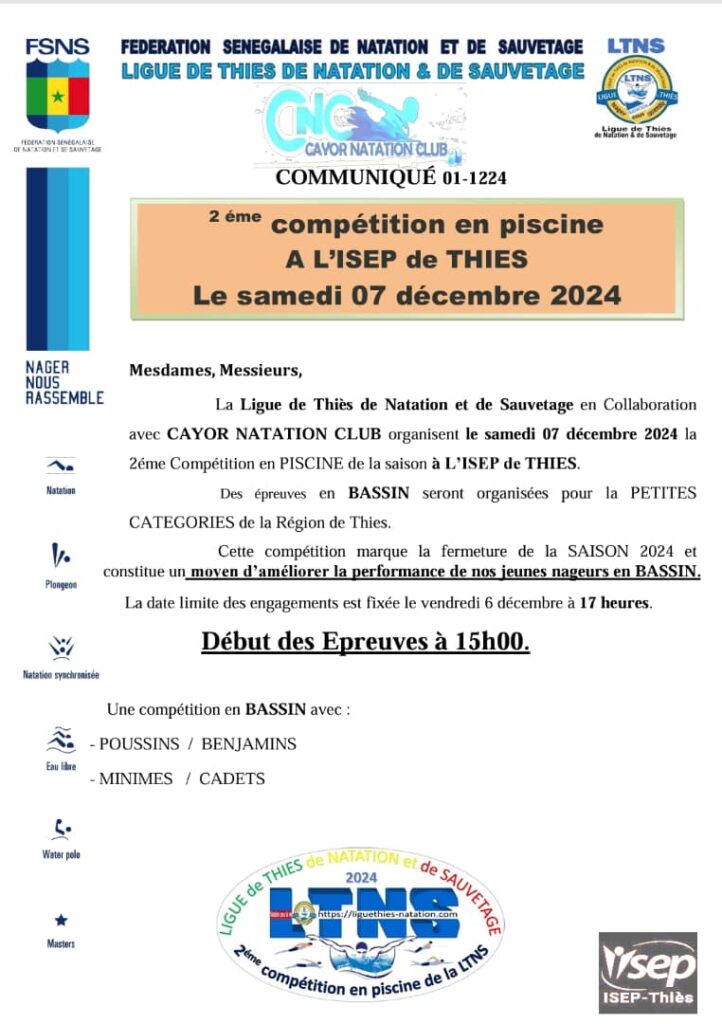 2ème Compétition en Piscine de la Ligue de Thiès prévue le samedi 07 décembre 2024